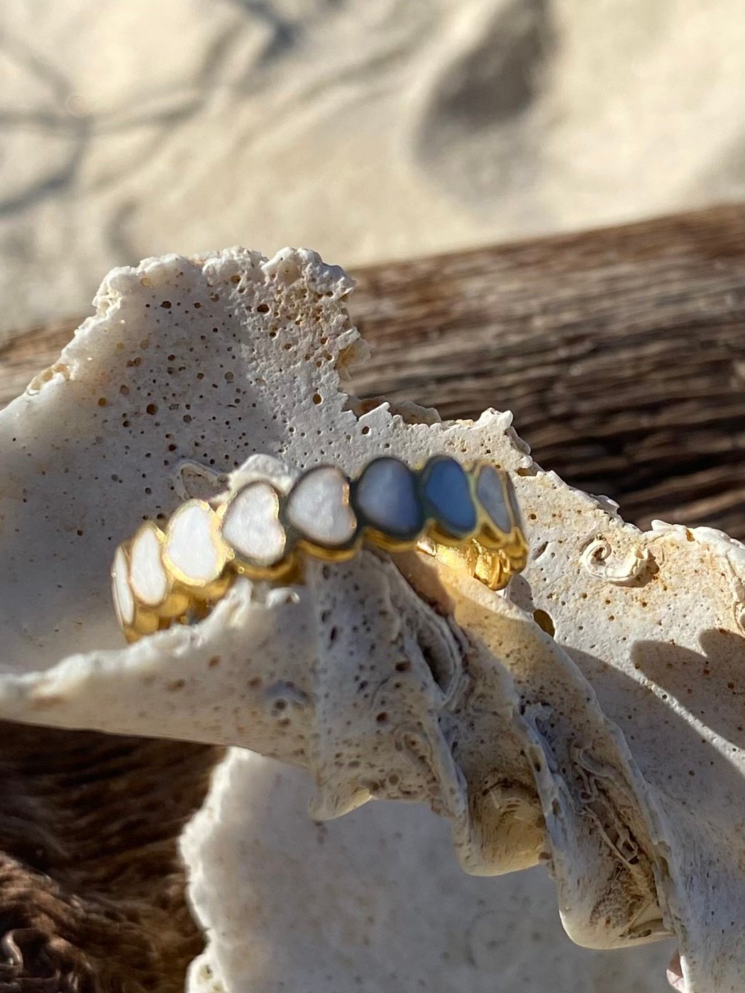 Featuring gold hearts with pearl inlay